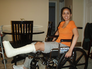 I was happy to be released on Monday (April 19) and so excited to come home. That day was much busier in the hospital and the new nurse definitely didn't have the time for me. I was impressed at how good my insurance company has been so far (let's hope it stays that way); I got a bunch of equipment to bring home and I didn't have to pay any co-pay: the walker, crutches, a wheelchair, and the commode (toilet seat with handles on the side that goes above your toilet seat). I was also impressed that my insurance covers at home care...a nurse came over on Monday to check my vitals and on Thursday I have a physical therapist coming over as well as the nurse again. They'll be coming over every week for the next 5 weeks. WOW! So far so good :)