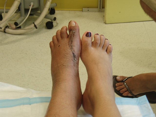 So it's finally my turn and what a relief it was to finally have my foot free and get a little more comfortable. But to be honest, I thought it looked worse than it did 4 weeks ago. My skin is soooo dry and my foot actually looked really dark, it's like one foot tanned and the other didn't (see pics below). Since I've never had surgery before this, I was a little worried but Dr. Feldman reassured me that it's healing just fine. The scariest thing is that he wants me to start walking on it NOW...and not little by little, to start immediately with the boot. And I'll have to wait on physical therapy. He wants me to see him again in 3 weeks and he'll recommend it then when I'm more used to walking. He also said to bring sneakers for my next appointment...oh boy!!!!